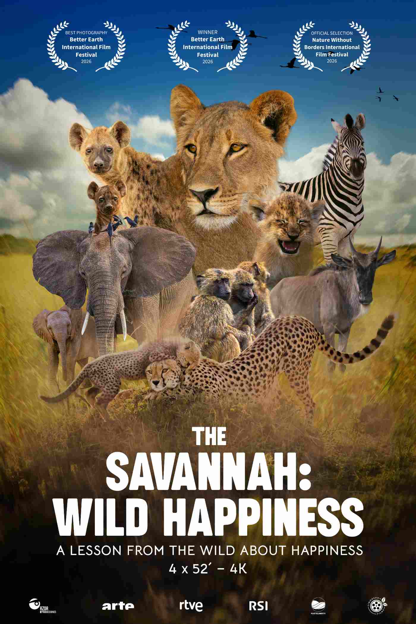 “The Savannah: Wild Happiness” is a blue-chip wildlife documentary series that explores the unique philosophy of life practiced by wild animals, based on four main pillars: living with passion, living without fear, living with love, and living in the present.